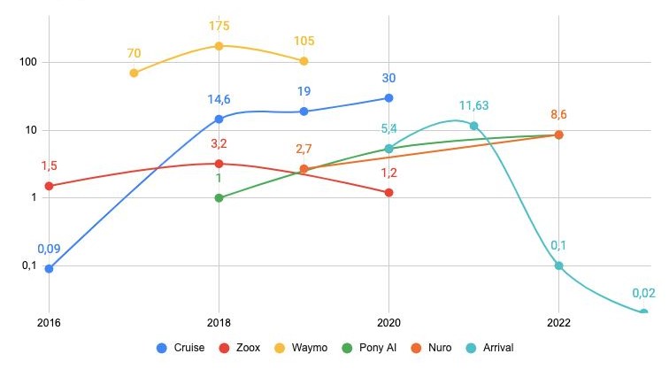 - Some companies (Aurora Innovation, Arrival) went public. The projects with strong corporate backing, Waymo (a division of Google) and Cruise (the autonomous vehicle division of General Motors), achieved the highest market valuations during this period.
